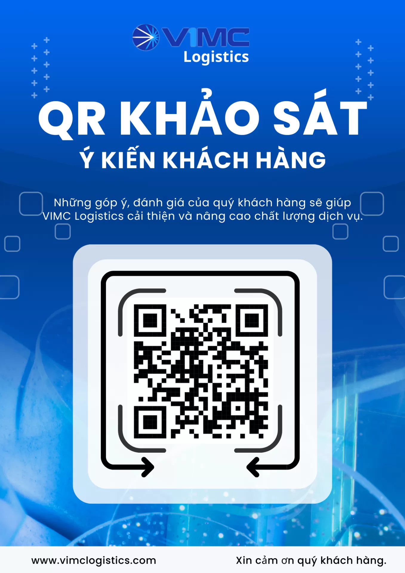 Rất mong Quý Khách dành 2–3 phút chia sẻ ý kiến thông qua link khảo sát dưới đây. Mọi phản hồi của Quý Khách là cơ sở quan trọng để VIMC Logistics cải tiến dịch vụ ngày càng hiệu quả và phù hợp hơn.